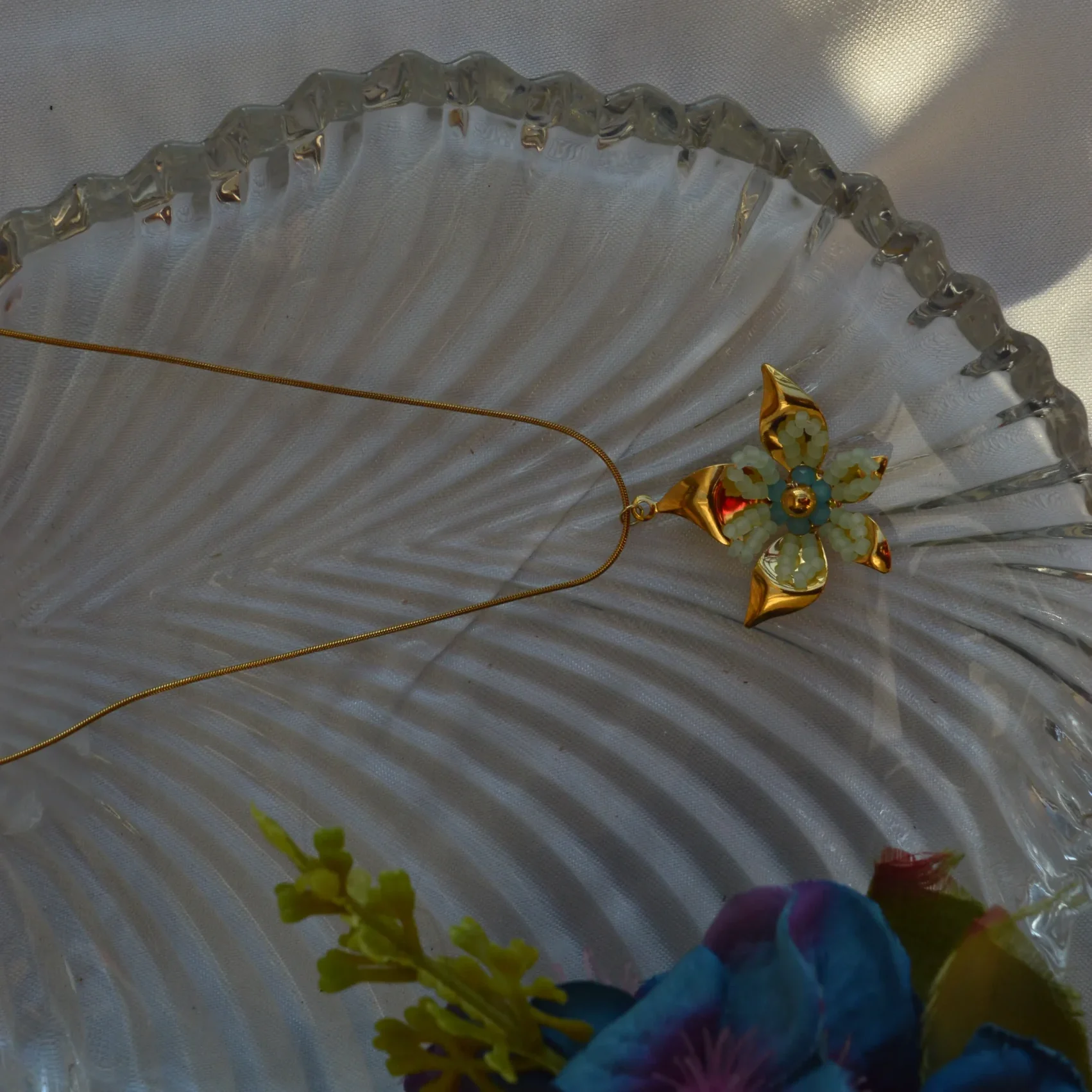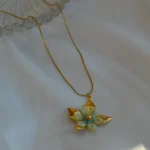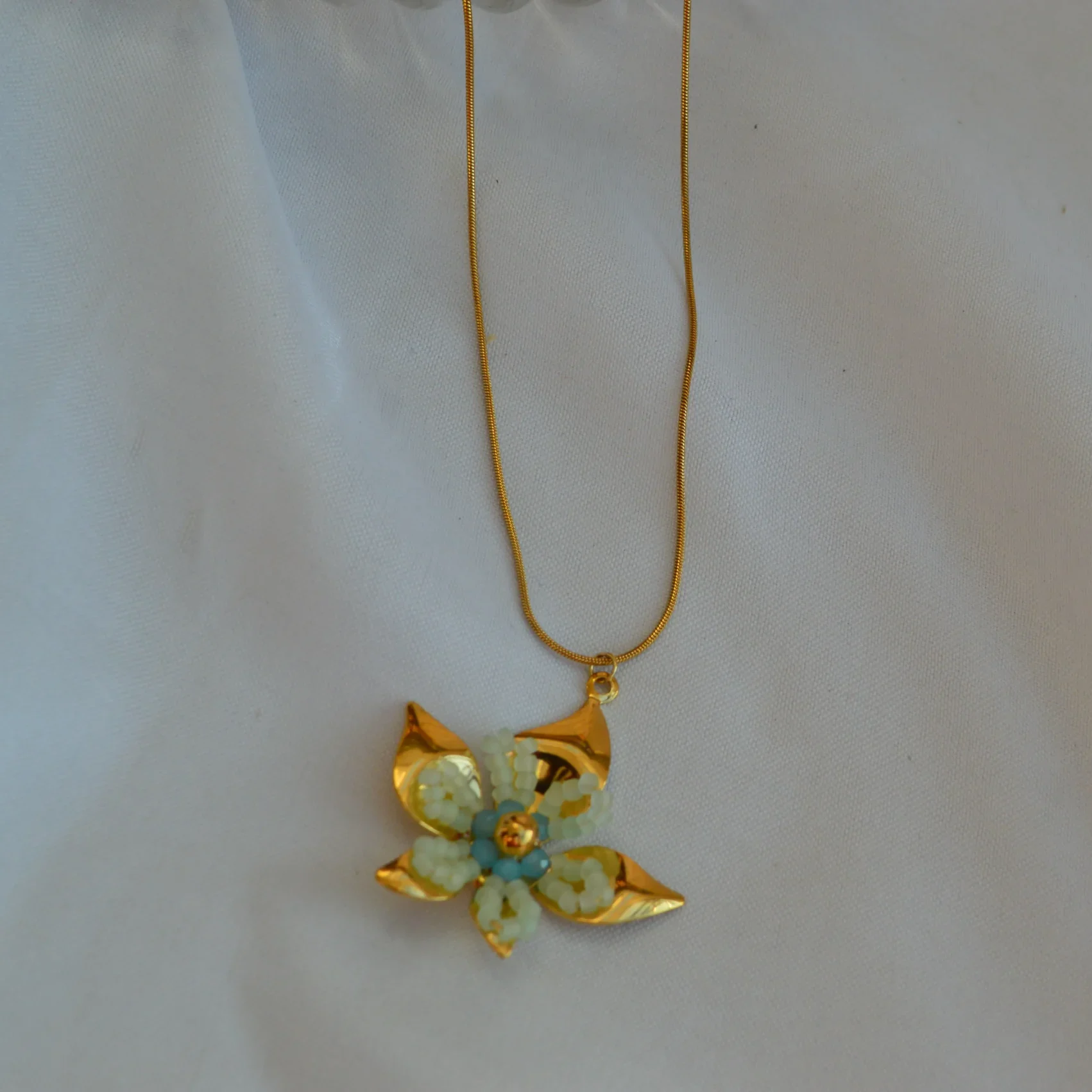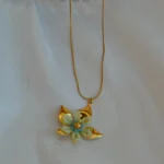 The Aqua Bloom Petal Pendant captures the charm of nature with its soft colours and graceful design. Shaped like a blooming flower, the pendant features pastel aqua enamel petals accented with golden edges that add warmth and radiance to the piece.