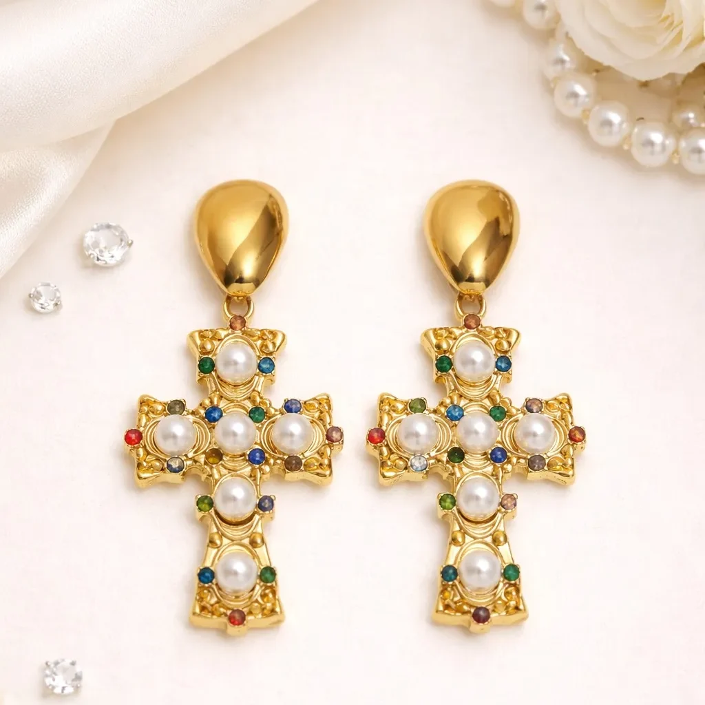 Aurora Cross Pearl Earrings A refined expression of elegance, the Aurora Cross Pearl Earrings feature a graceful cross silhouette adorned with luminous pearls and delicate multicolour crystal accents. Finished with a polished gold-tone base, this pair brings a perfect balance of tradition and contemporary charm—ideal for festive occasions, celebrations, and statement styling.