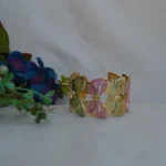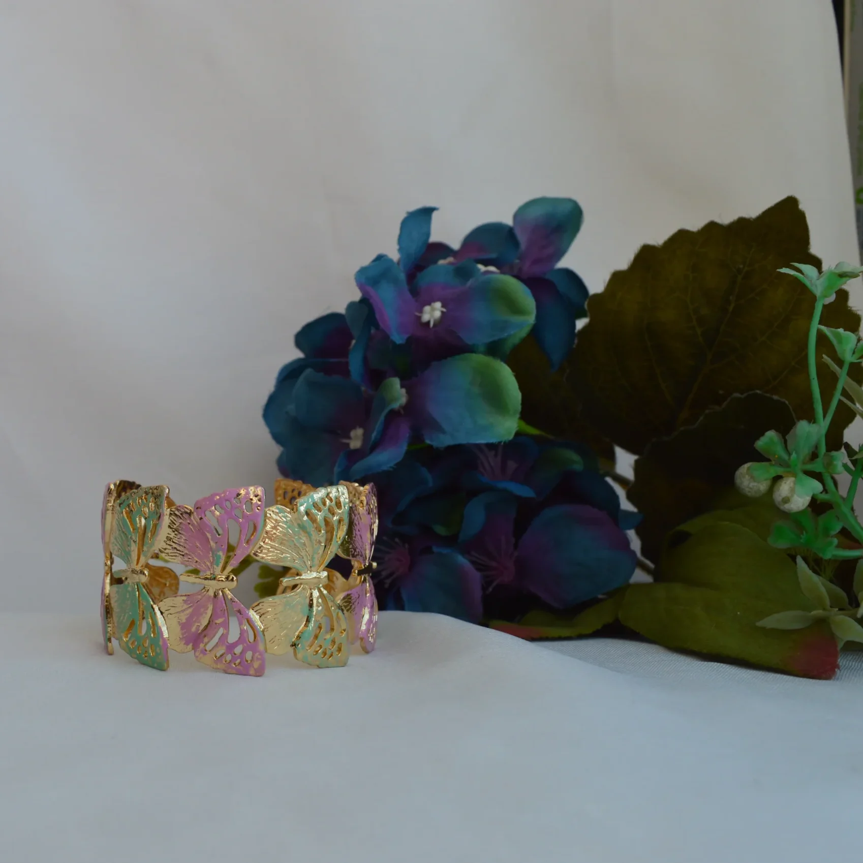 Graceful and dreamy, the Aurora Flutter Cuff captures the delicate charm of butterflies in motion. Designed with finely carved butterfly motifs and soft pastel enamel accents in lilac and mint tones, this gold-finished bracelet radiates a whimsical yet elegant appeal. Crafted with premium materials and an anti-tarnish coating