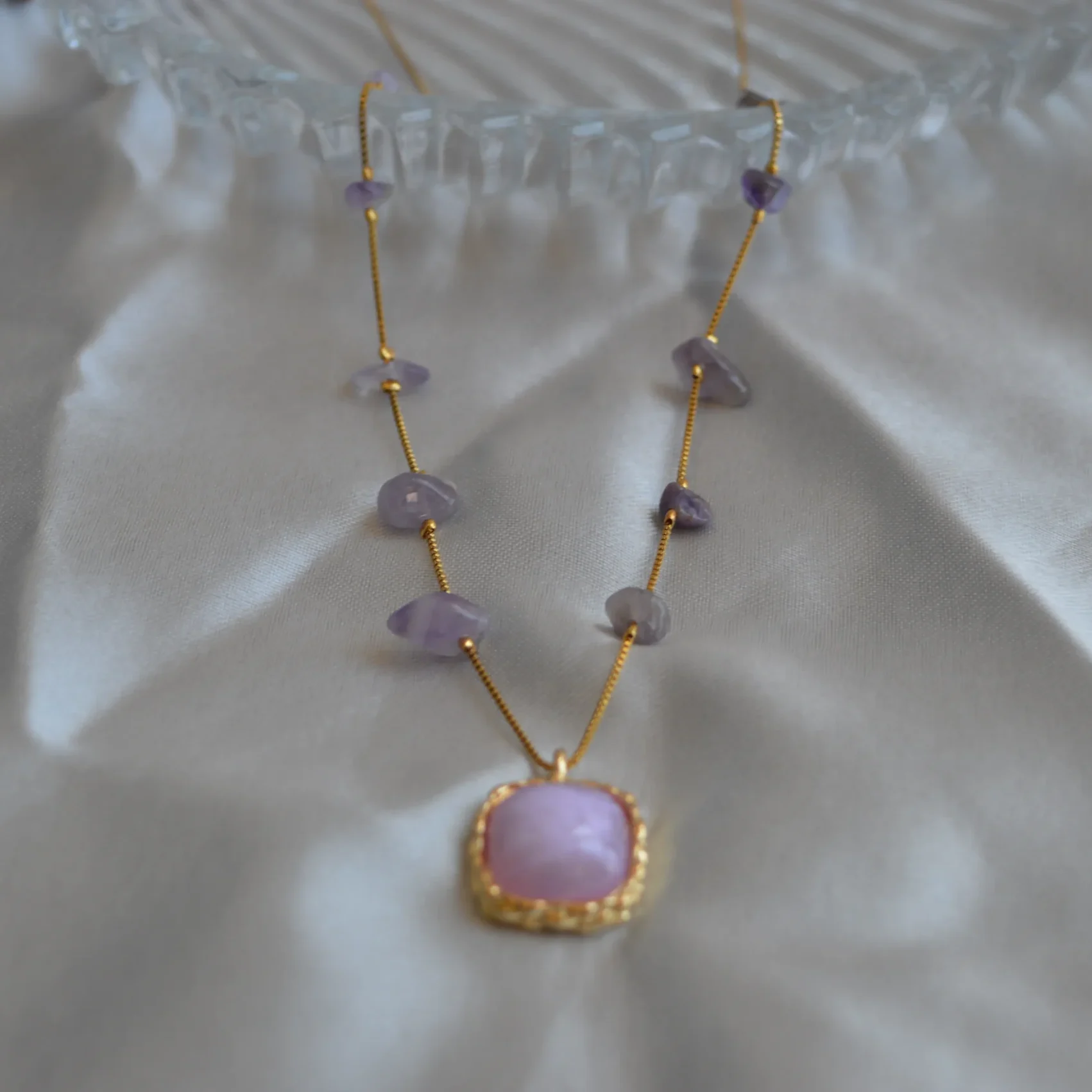 Elegant and timeless, the Blush Stone Charm Necklace exudes understated sophistication. Featuring a soft pink gemstone encased in a textured gold-toned frame, this pendant rests gracefully on a delicate chain adorned with earthy brown beads.