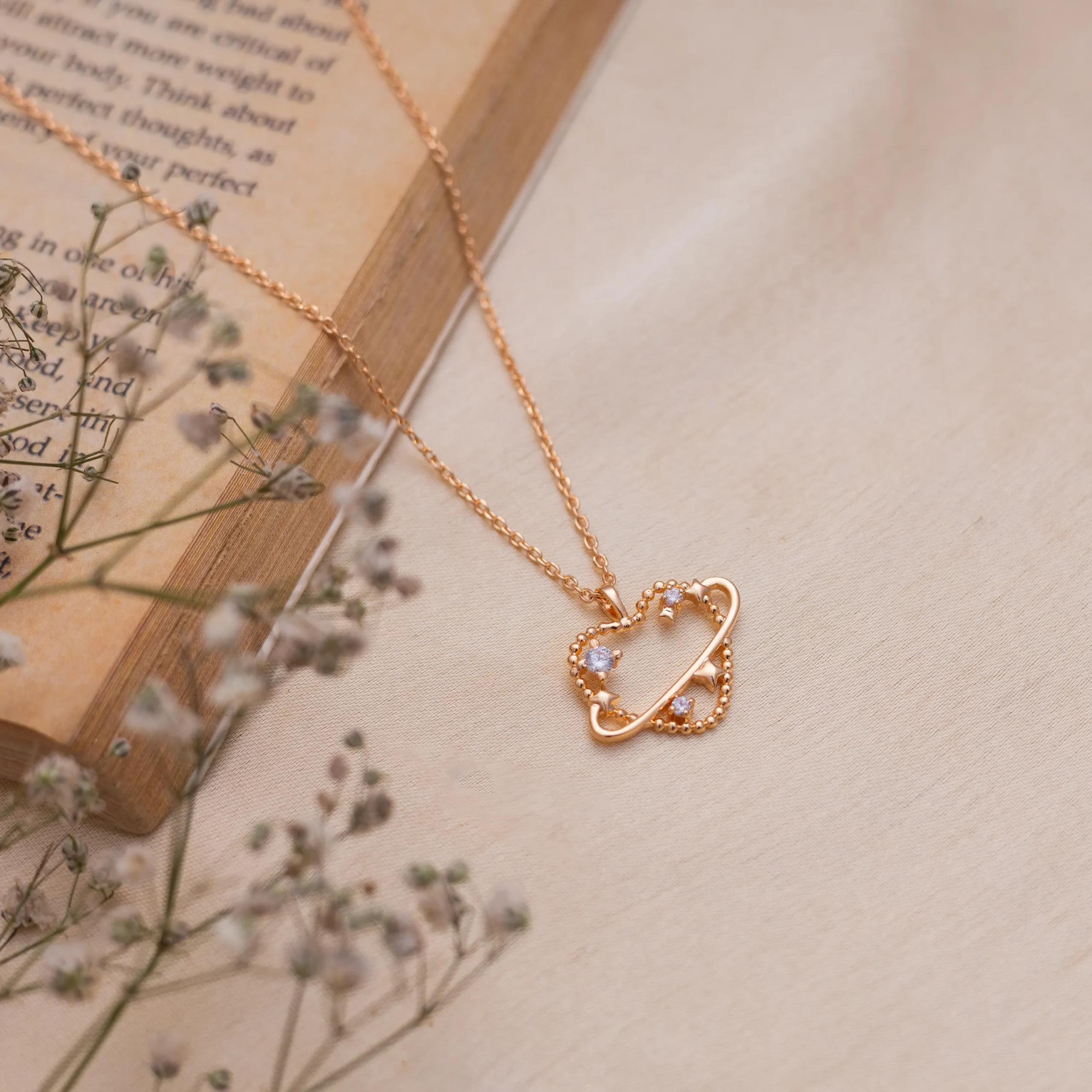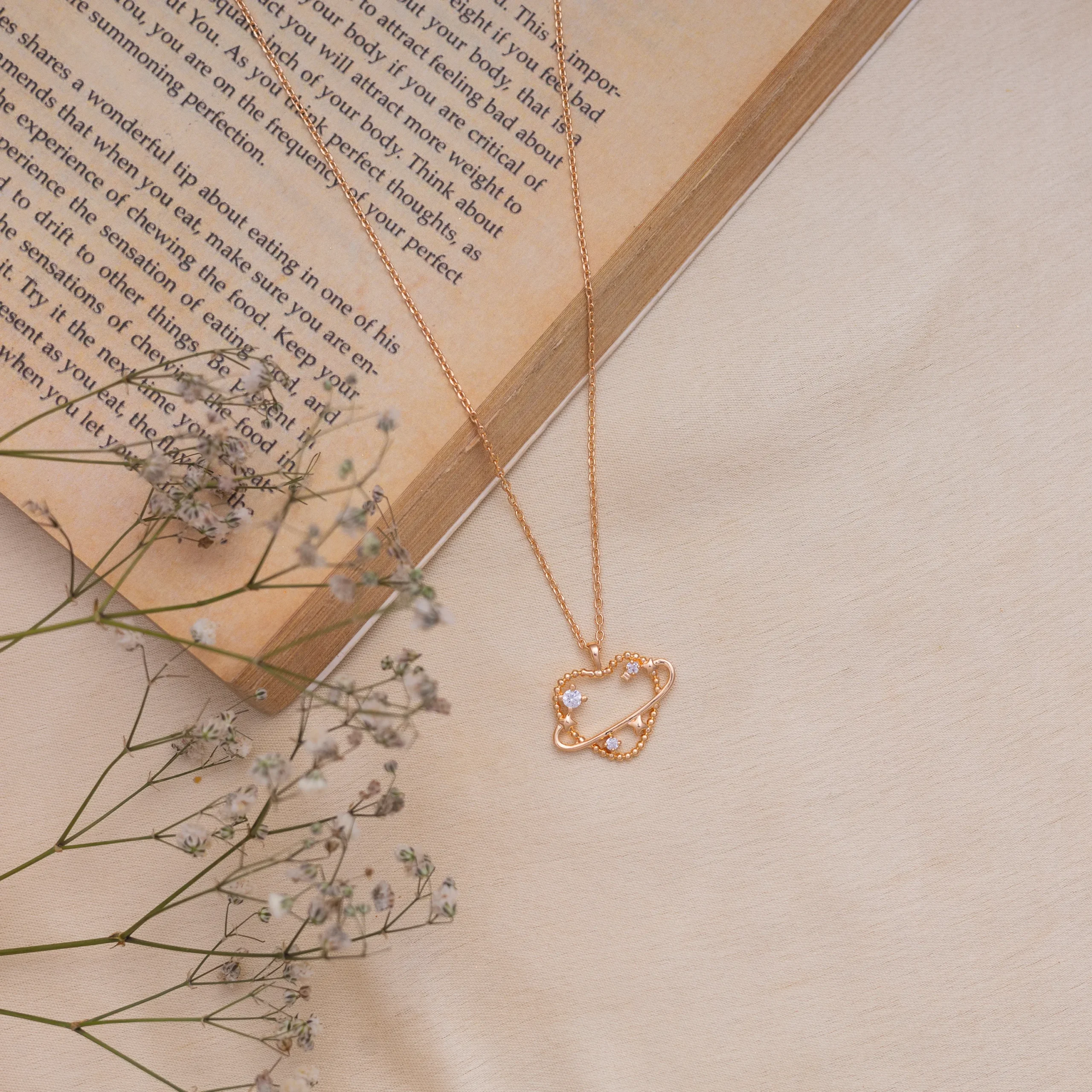 The Celestial Heart Rose Gold Necklace is a mesmerizing fusion of romance and cosmic beauty. Crafted in luminous rose gold, this pendant features a delicate open heart adorned with tiny stars and shimmering cubic zirconia stones, symbolizing love that shines brighter than the stars. A sleek orbit-like band gracefully encircles the heart, adding a modern celestial touch that represents connection, infinity, and harmony.