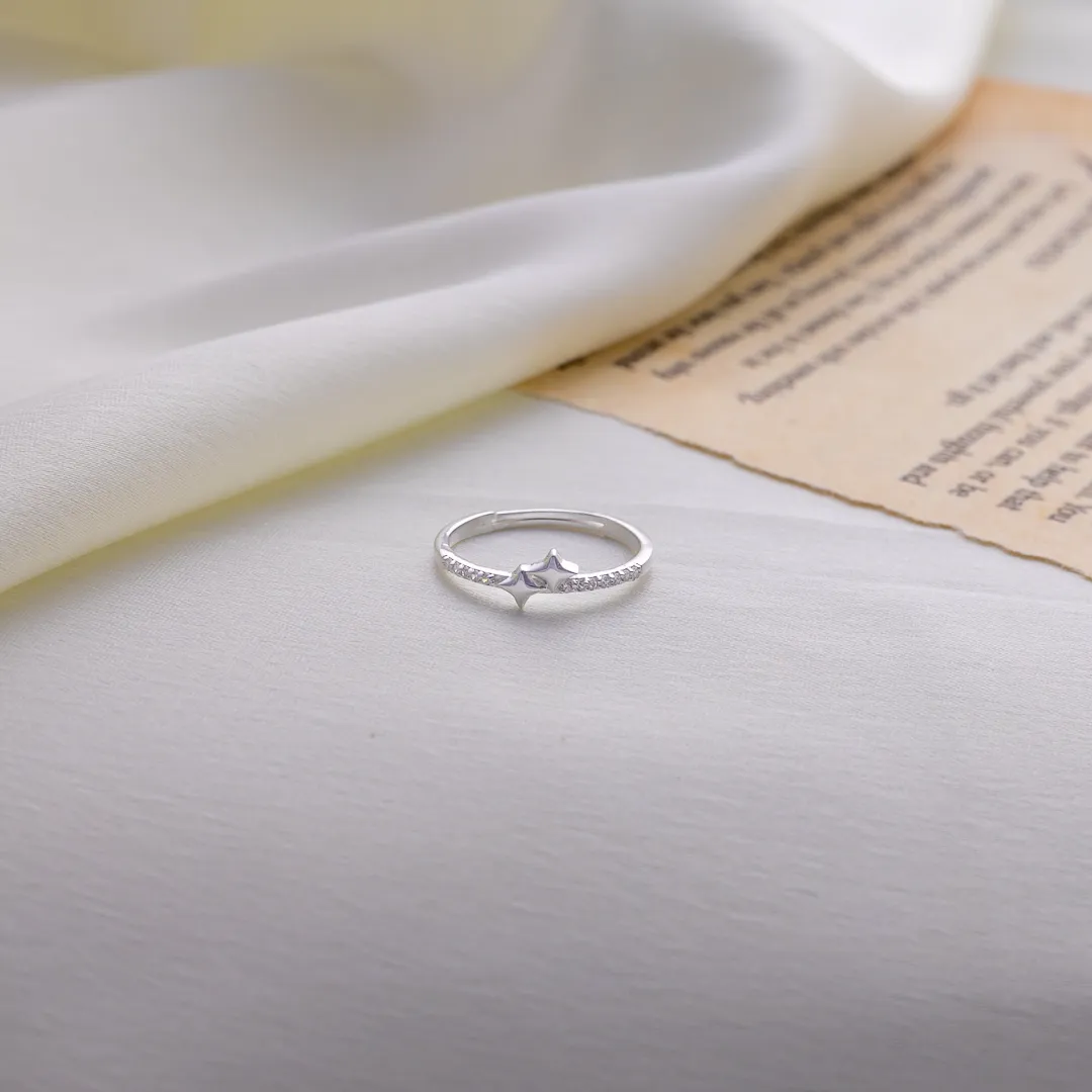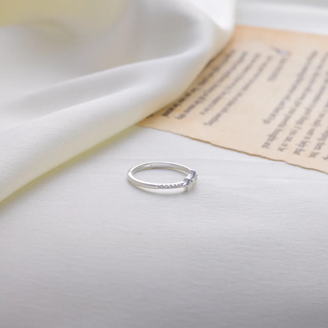 A trail of sparkling stones along the band adds subtle brilliance, like a constellation glittering across a night sky. Lightweight and refined, this ring is perfect for everyday elegance, stacking, or gifting to someone who lights up your world.