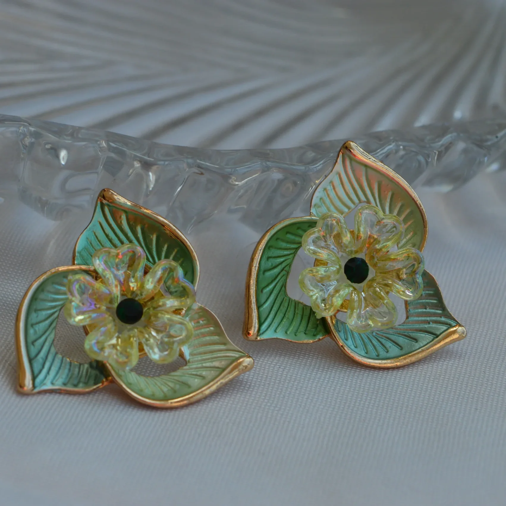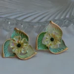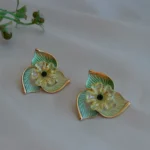 Celebrate timeless elegance with the Emerald Petal Bloom Earrings, a stunning pair inspired by nature’s soft curves and delicate florals. Each earring features layered enamelled petals in soothing shades of green, highlighted with golden detailing that adds a luxurious touch.