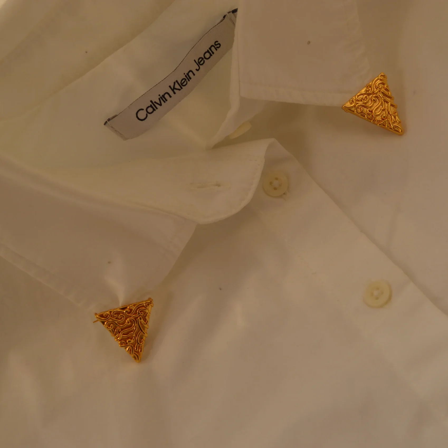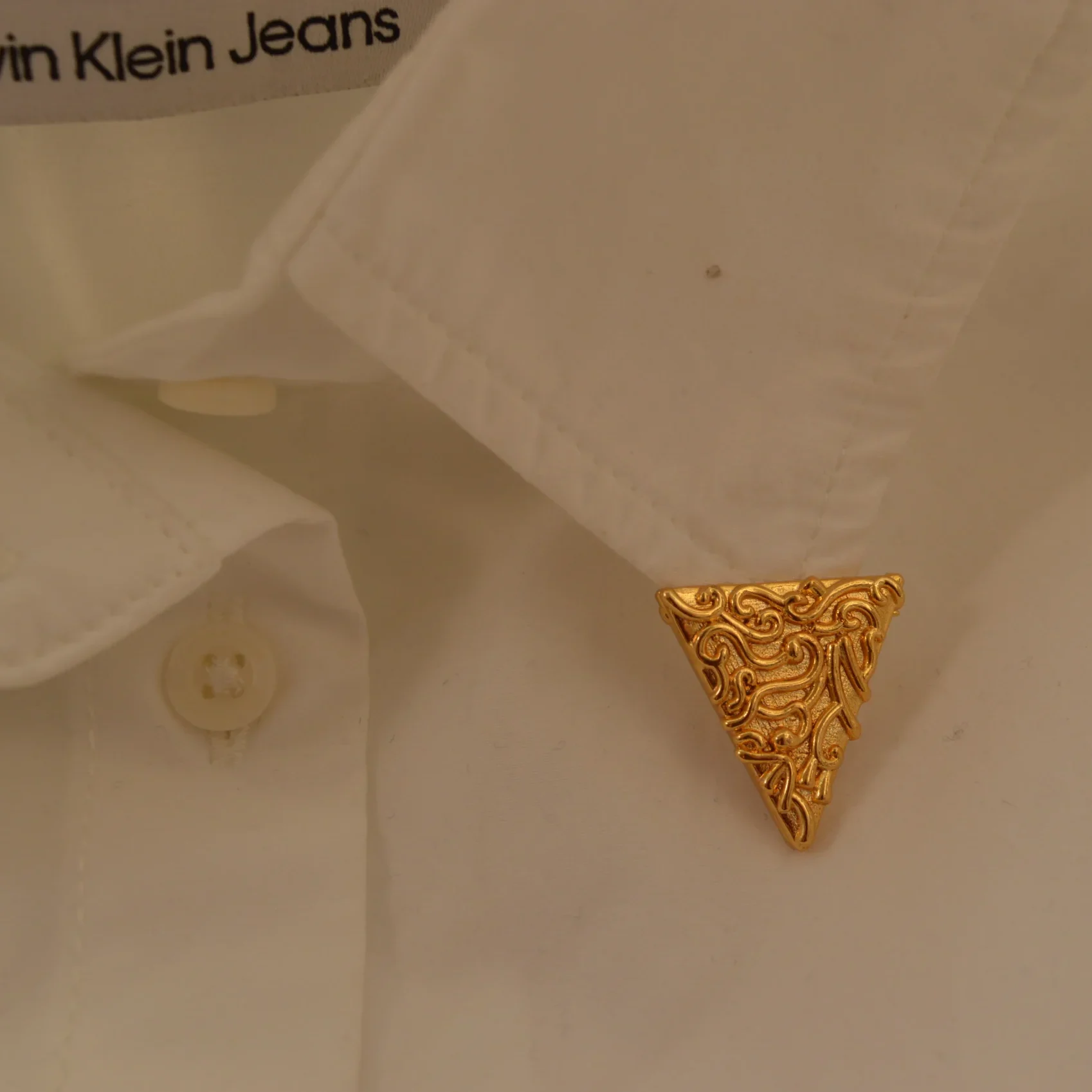 Add a sharp touch of elegance to your everyday shirts with the Golden Triangle Collar Pin. Designed in a sleek triangular silhouette with intricate textured detailing, this piece brings a modern edge to classic tailoring. Whether styled on crisp white shirts or layered under blazers, this collar pin instantly elevates your look—perfect for minimal lovers who appreciate statement details in subtle form.