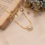 The Golden Aura Floral Necklace radiates the brilliance of timeless beauty and feminine charm. Designed in a captivating floral motif, this exquisite pendant features a central round crystal surrounded by delicately arranged petal-shaped stones, all set in a luxurious gold finish. Each facet catches the light effortlessly, creating a breathtaking shimmer that symbolizes warmth, confidence, and sophistication.