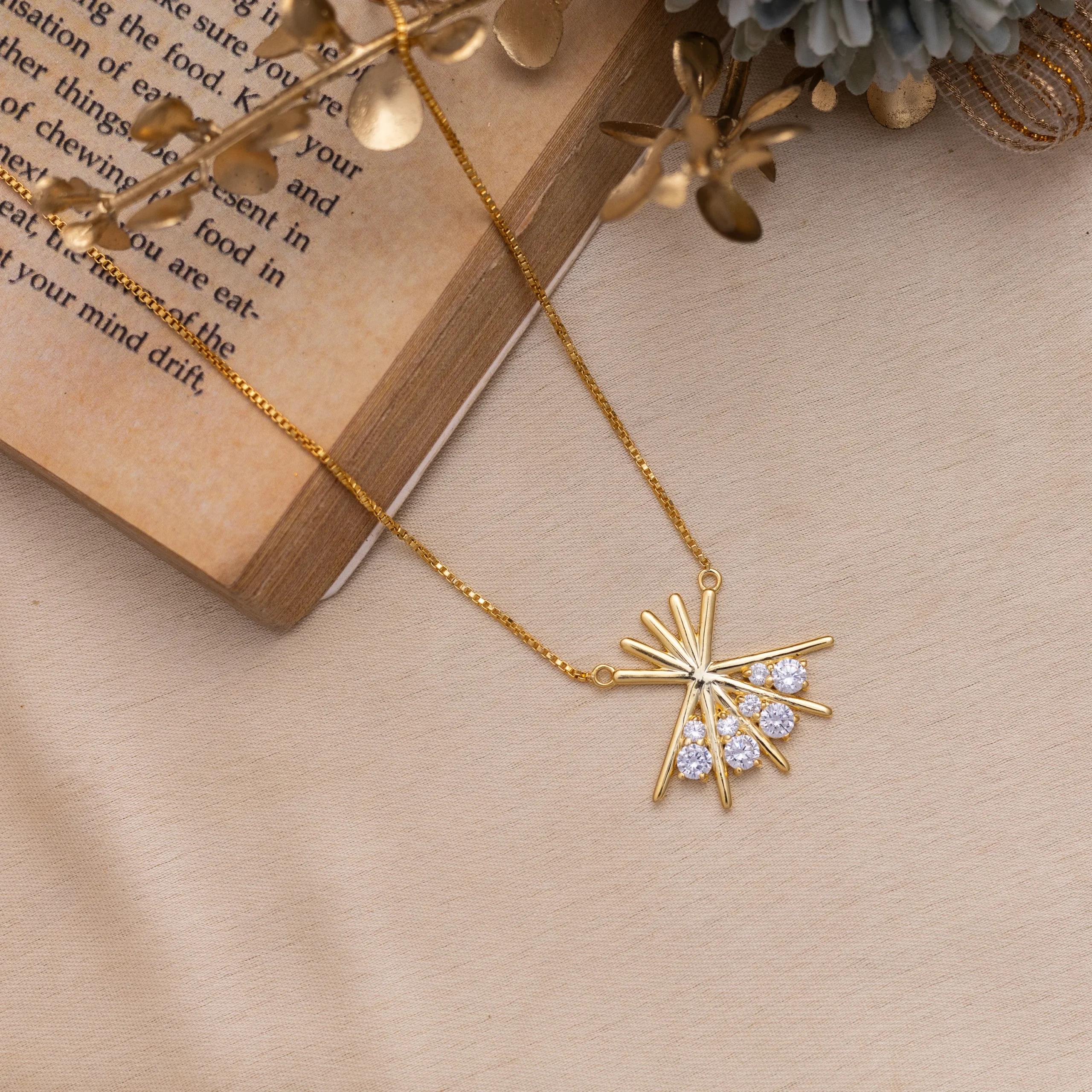 Golden Bloom Pendant- This pendant has a fan-inspired design that radiates outward with symmetrical lines and ends in a trio of sparkling stones, evoking movement and celebration. The structure is geometric yet festive, reminiscent of traditional motifs with a modern twist.