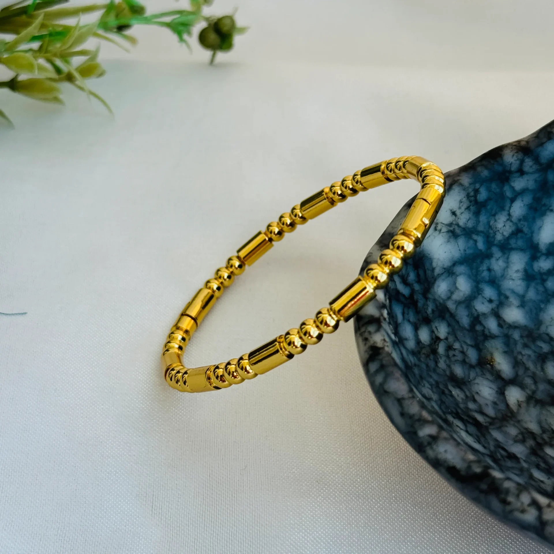 A classic gold-toned bead bracelet crafted with finely detailed cylindrical and round beads, reflecting timeless elegance and traditional charm. Versatile and refined, it’s perfect for everyday wear or layering with other bracelets for a graceful statement.