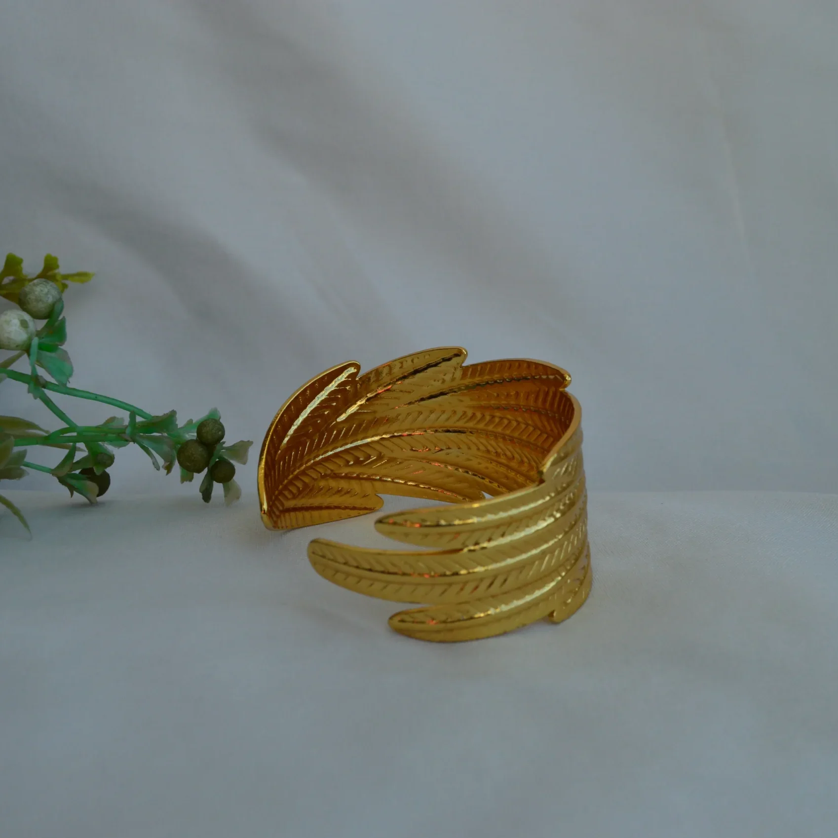 Elegant and nature-inspired, the Golden Palm Whisper Cuff features layered palm leaf motifs gracefully wrapped around the wrist. Crafted in a radiant gold-tone finish, this bracelet exudes tropical charm blended with timeless sophistication.