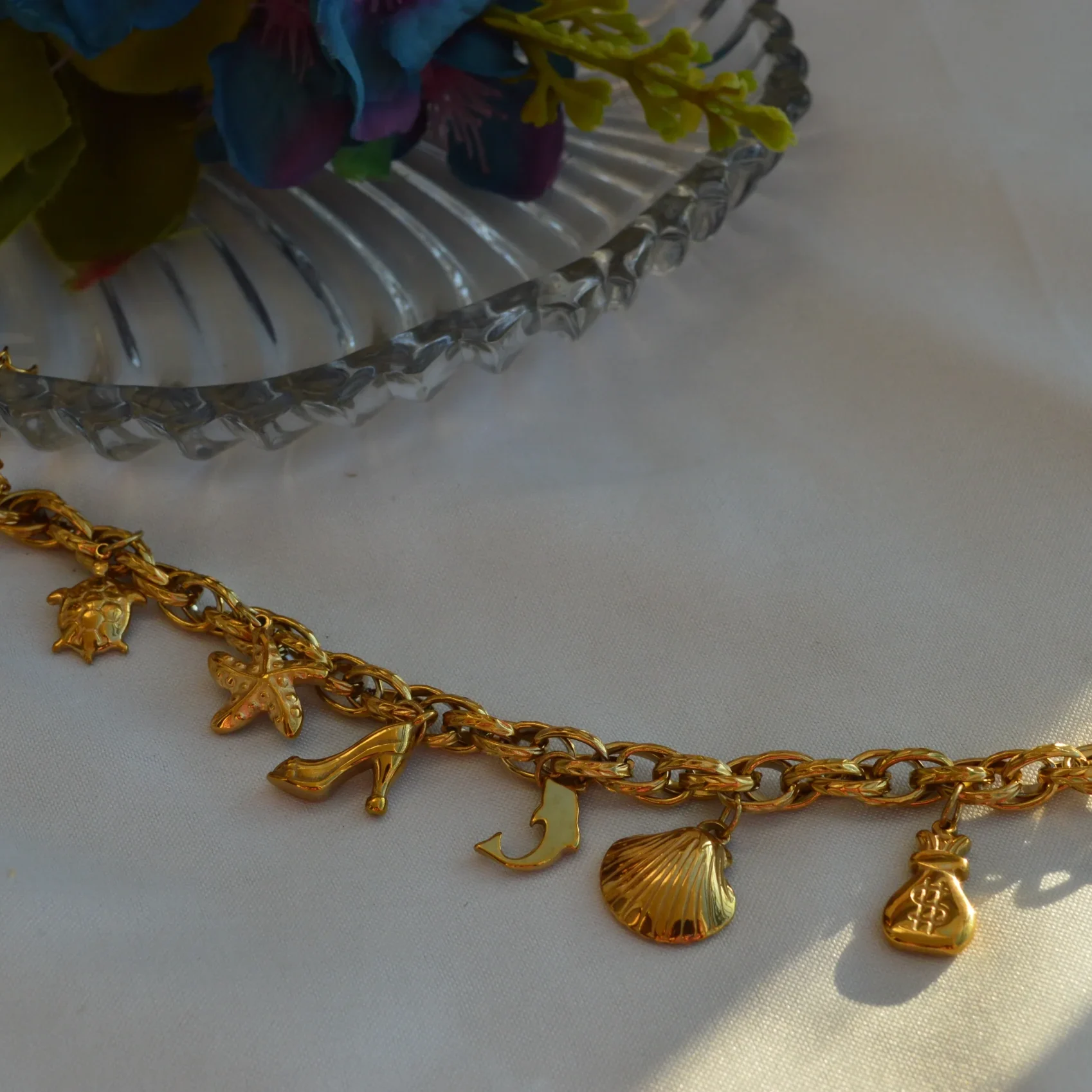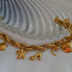 The Golden Wanderlust Charm Bracelet is a fun and expressive accessory designed for the free-spirited soul. Suspended from a textured golden chain are a collection of whimsical charms—a star, a starfish, a high heel, a crescent moon, and a seashell.