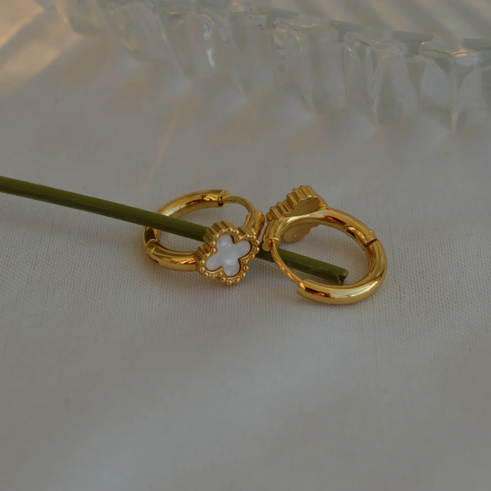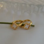 The Ivory Clover Mini Hoops are a perfect blend of simplicity and charm. Designed with dainty gold-toned hoops, each earring features a petite four-petal clover charm in soft ivory enamel, symbolizing luck and elegance. The Ivory Clover Mini Hoops are a perfect blend of simplicity and charm. Designed with dainty gold-toned hoops, each earring features a petite four-petal clover charm in soft ivory enamel, symbolizing luck and elegance.