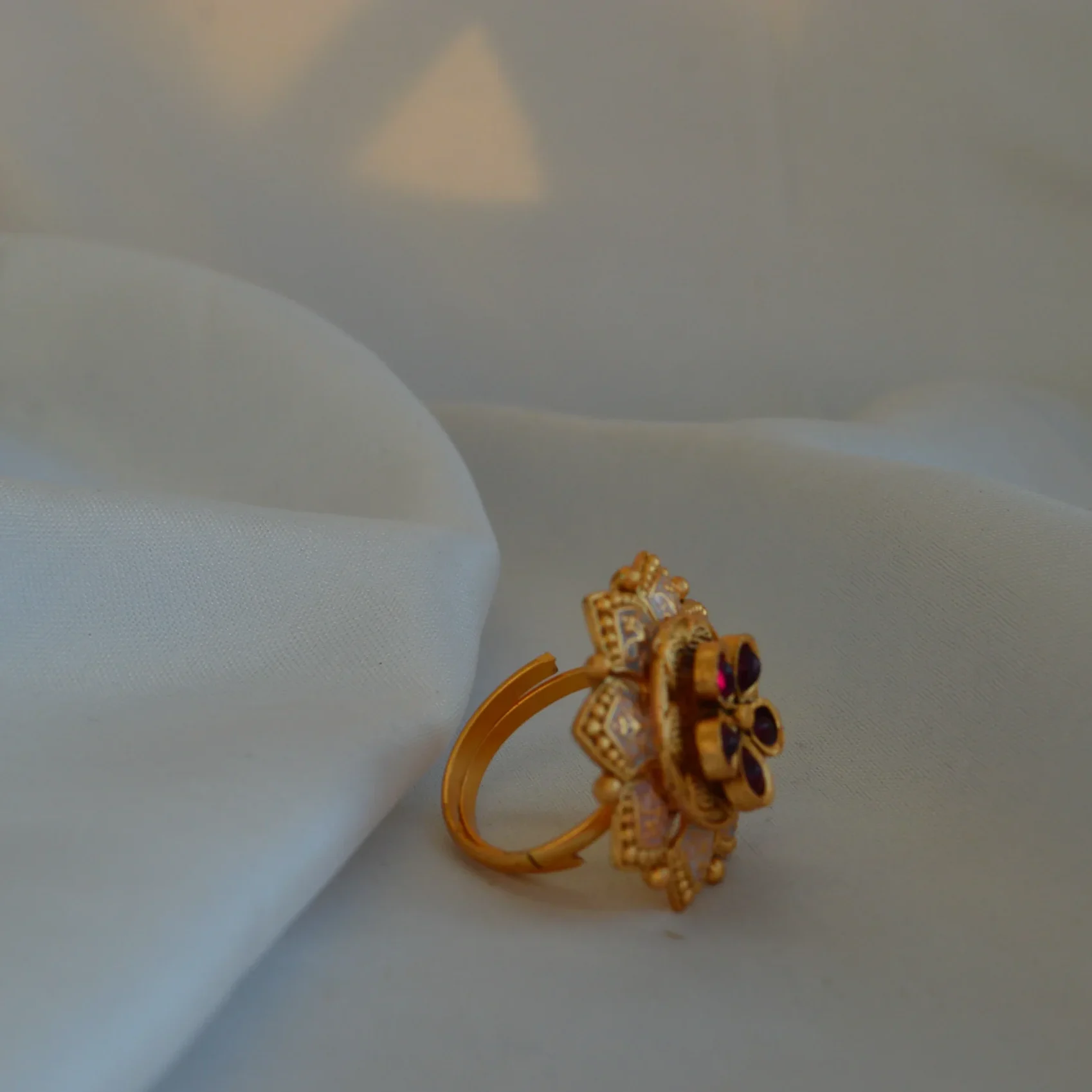 Intricately traditional and rich in cultural symbolism, the Kumkum Mandala Antique Ring features a stunning floral mandala design crafted in a royal antique gold finish. The center highlights deep ruby-toned stones arranged in a classic petal formation, radiating auspicious charm and temple-inspired beauty.