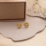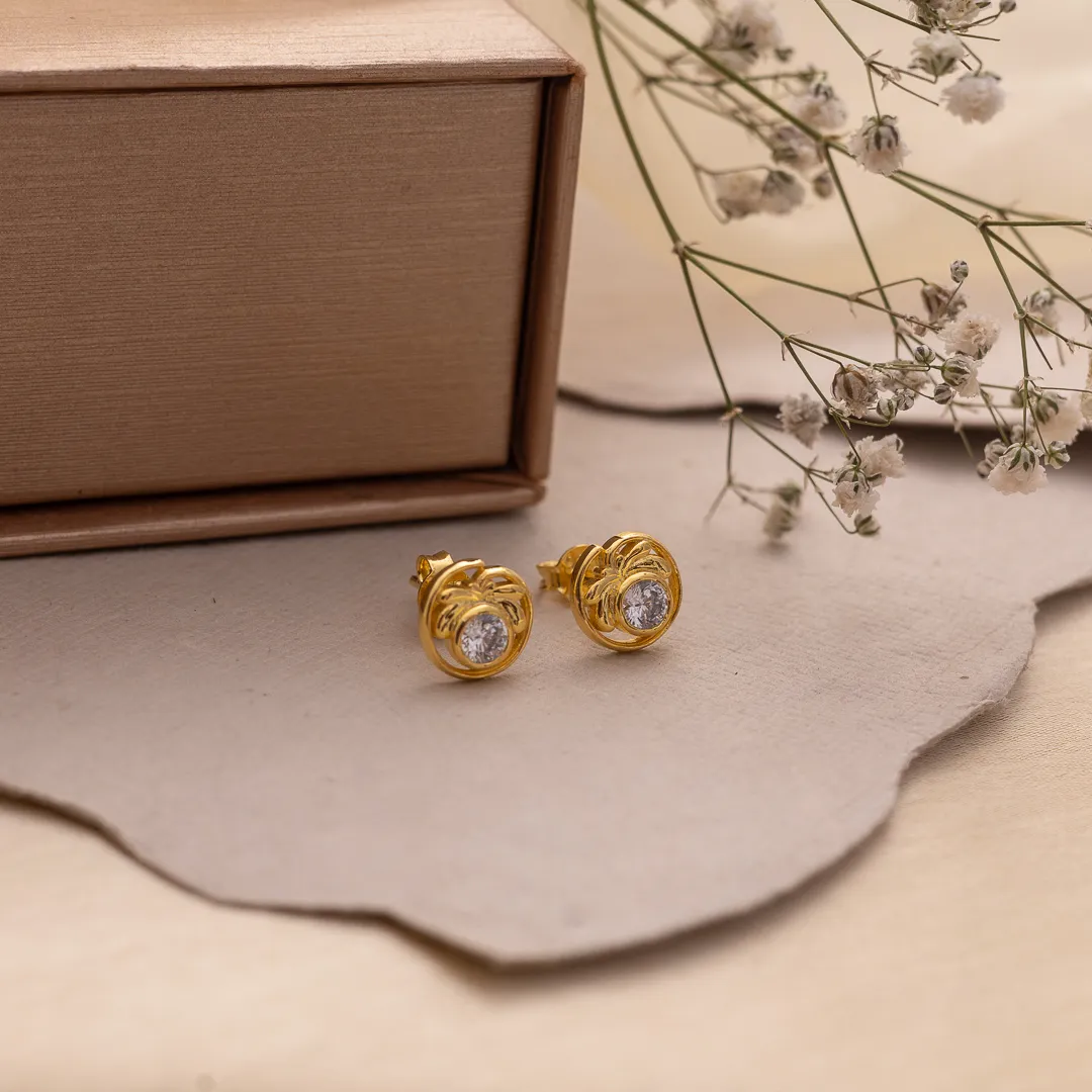 A graceful fusion of nature and elegance, these round stud earrings feature a single sparkling stone at the center, surrounded by intricately textured metal shaped like delicate leaves. The design evokes a serene, organic charm—perfect for adding a subtle statement to any look.
