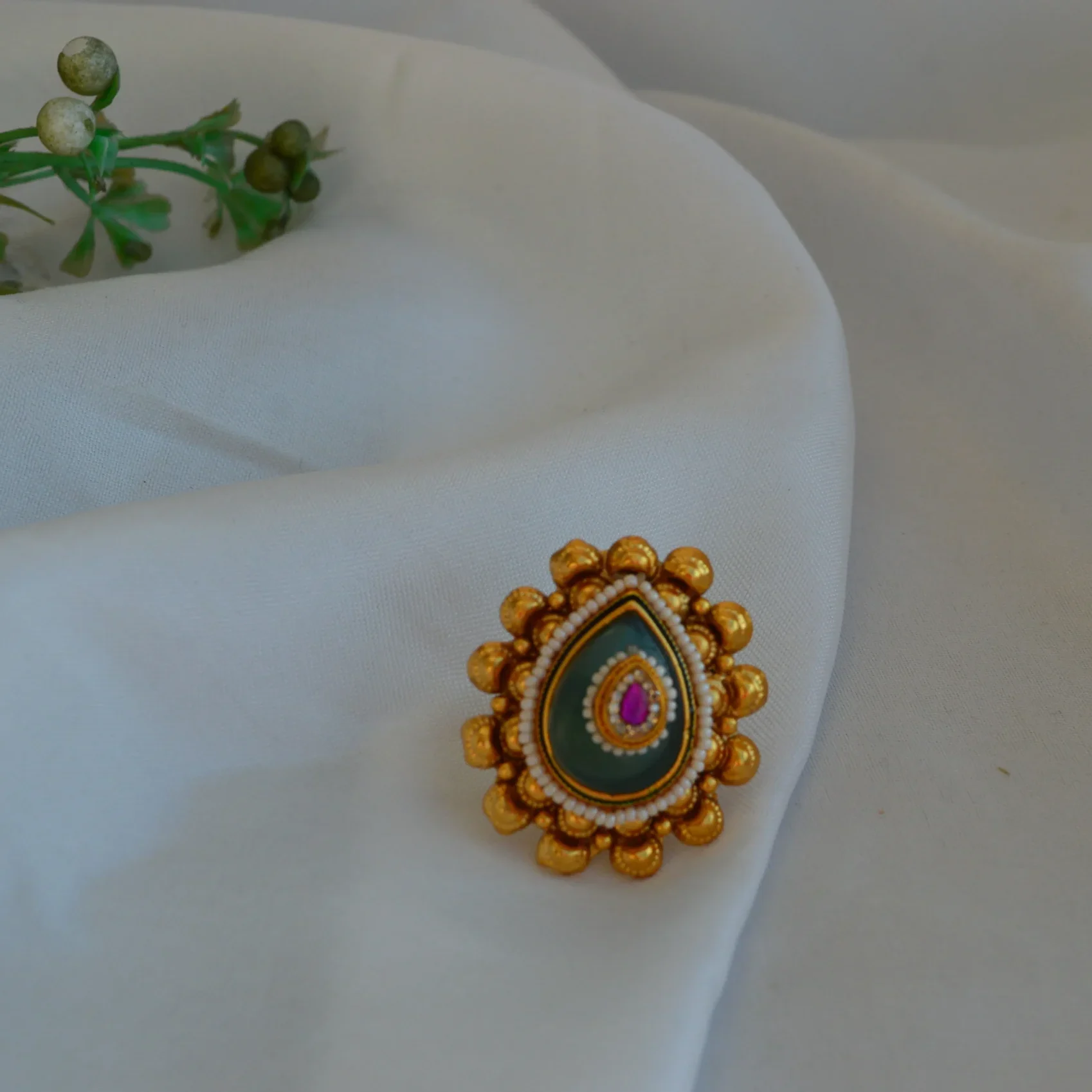 Regal and refined, the Maharani Teardrop Kundan Ring brings timeless elegance to your jewelry collection. This stunning piece features a deep emerald-colored teardrop base adorned with a central magenta kundan detail, surrounded by delicate white micro-beads that enhance its iconic shape