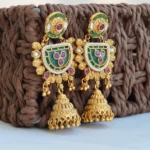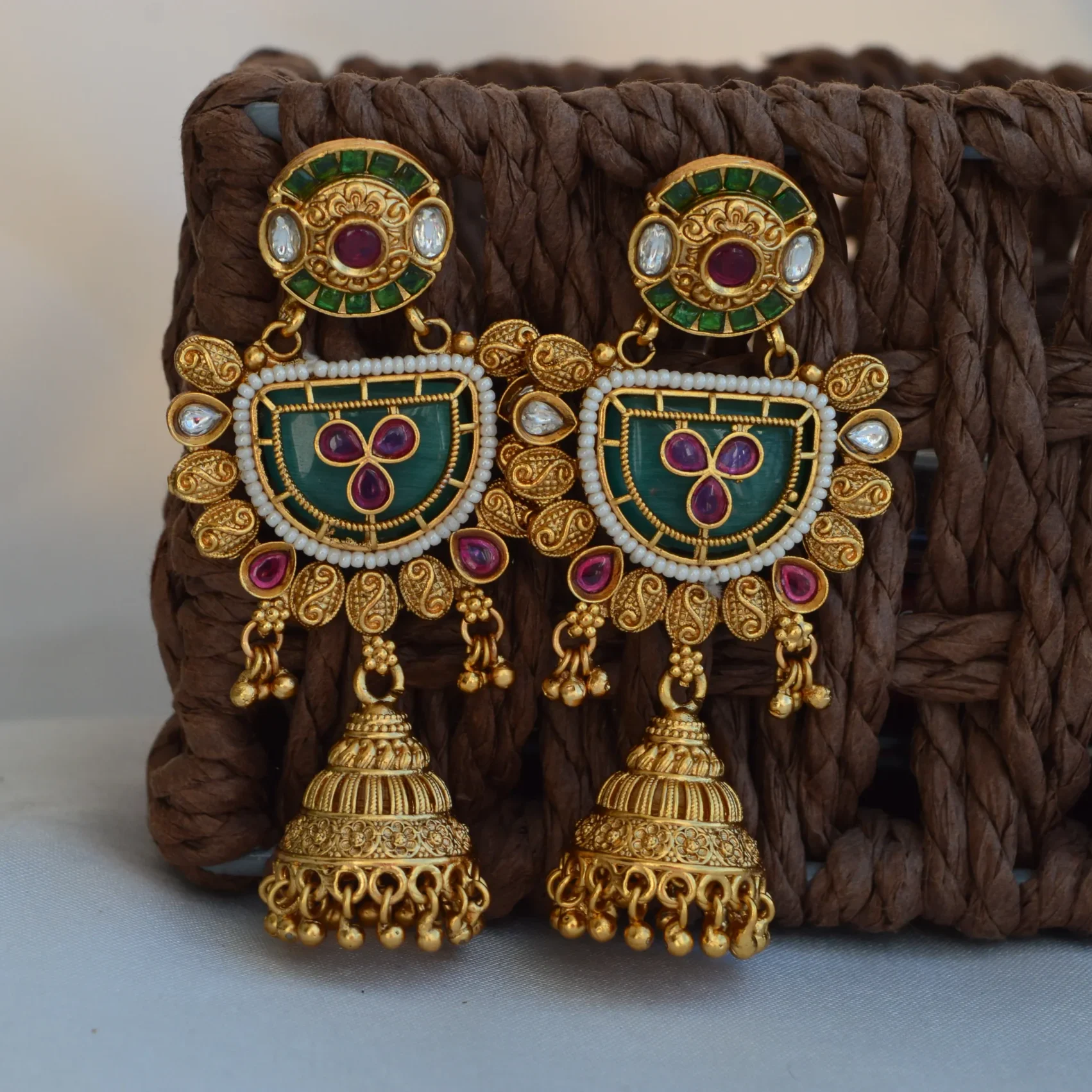 The Majestic Lotus Doli Jhumkas beautifully capture the grandeur of traditional Indian jewellery with their intricate detailing and royal colours. Each piece begins with a round stud featuring green enamel and a ruby-toned stone at the centre, setting the tone for luxury and heritage.