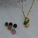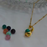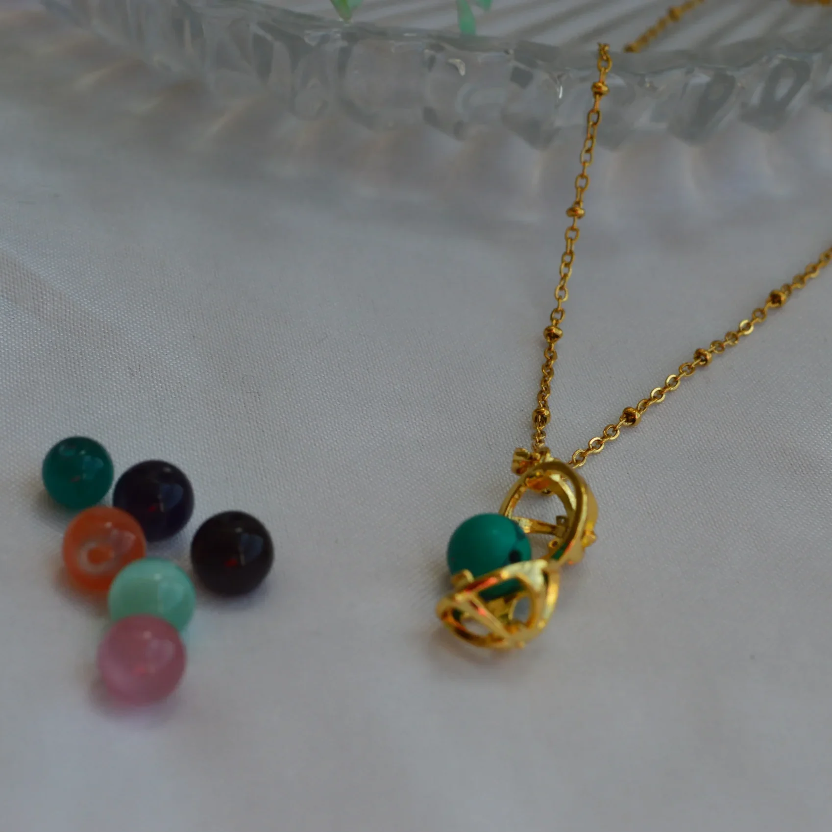 The Mystic Orb Charm Necklace celebrates colour, creativity, and modern elegance. The pendant features a cluster of smooth gemstone-like beads—set within a sculpted golden frame—that creates a soft, charming pop of colour.