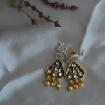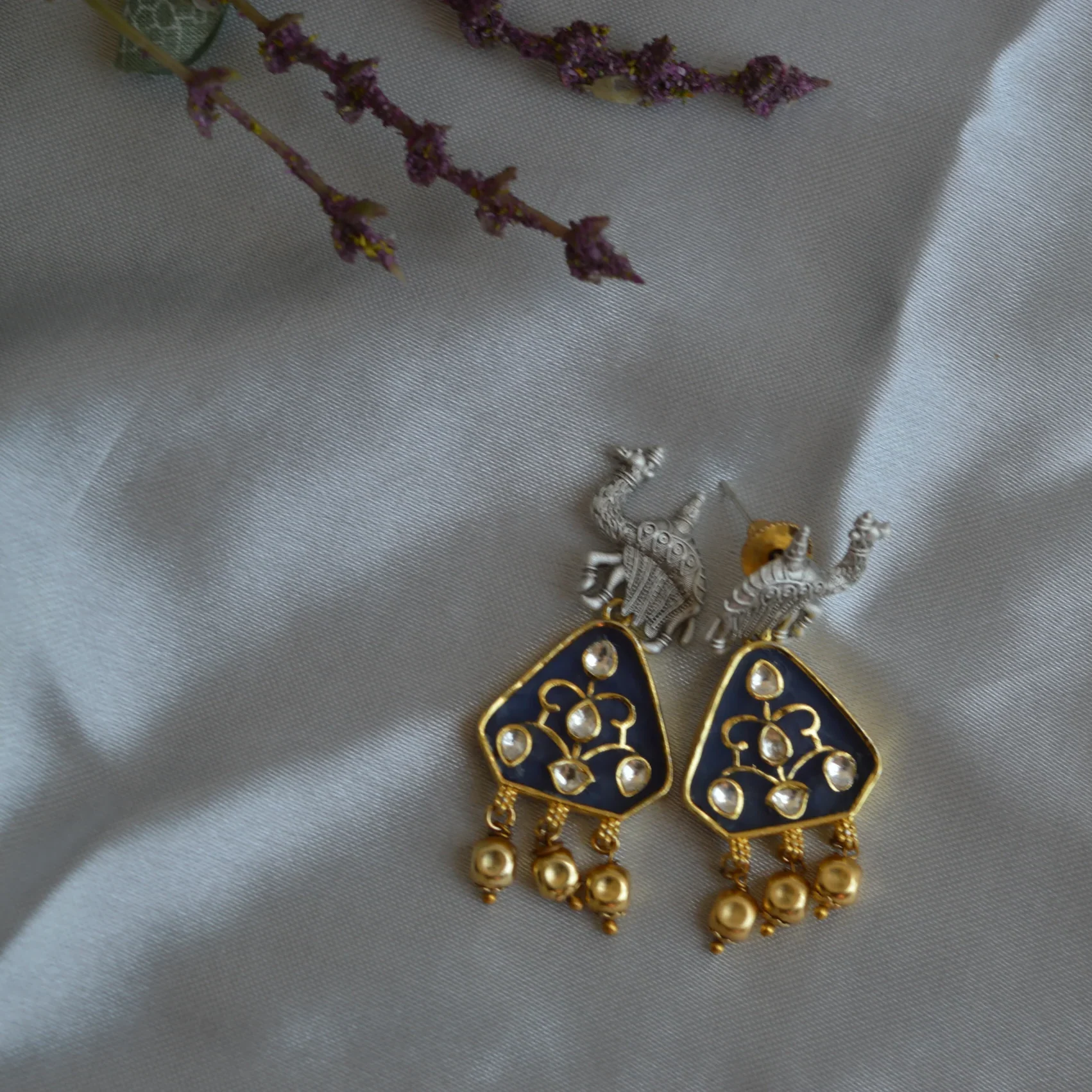 The Noor Meenakari Drop Earrings blend traditional artistry with refined elegance. Featuring a deep navy enamel base adorned with delicate golden motifs and kundan-style stones, these earrings capture the timeless charm of classic Indian craftsmanship.