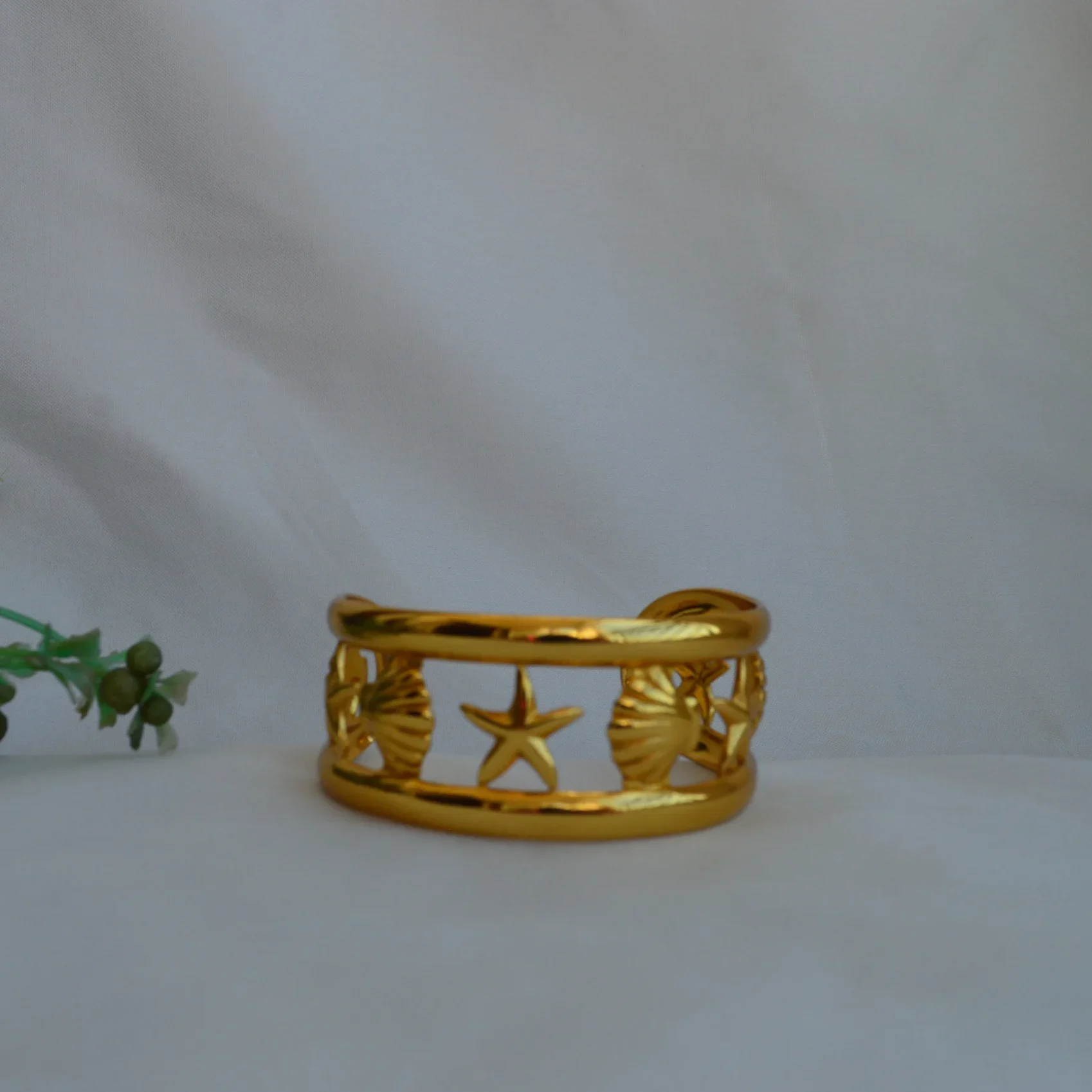 Bring the serenity of the seaside to your style with the Ocean Bliss Shell Cuff. Featuring beautifully sculpted starfish and seashell motifs, this gold-finished bracelet reflects the calm charm of ocean treasures. Crafted with high-quality metal and a premium anti-tarnish coating, it stays radiant and resists dullness, ensuring long-lasting shine and wear