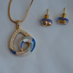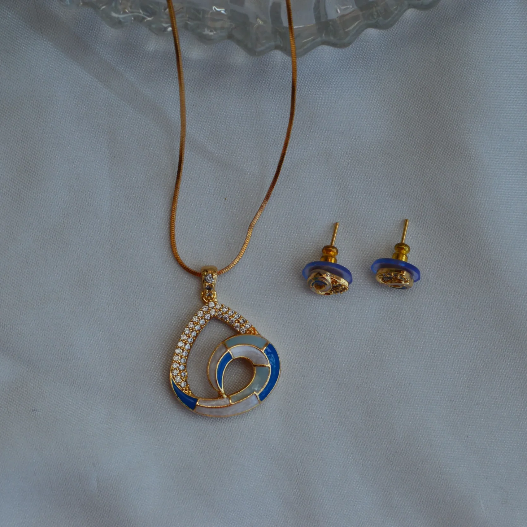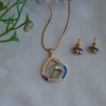 The Ocean Swirl Elegance Set blends modern artistry with a serene colour palette inspired by the sea. The pendant features interlocking swirl motifs highlighted with shimmering stones and enamel detailing in soothing shades of blue, white, and soft peach.