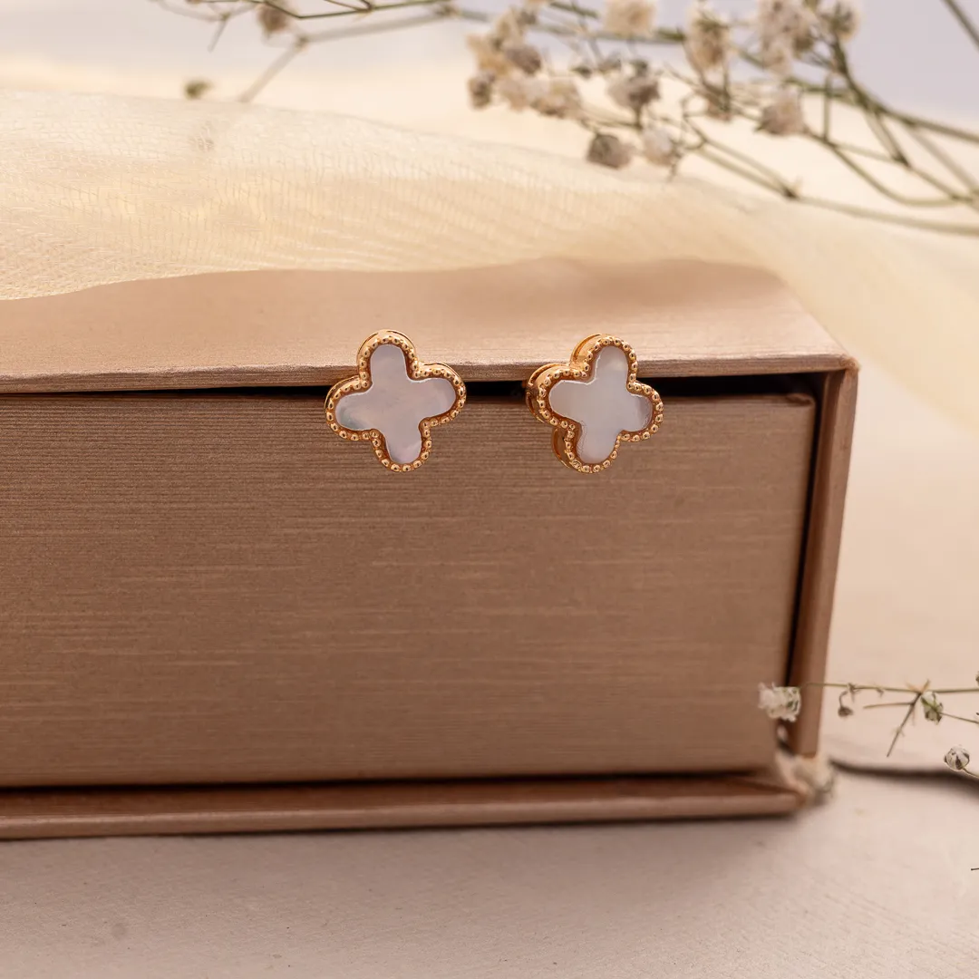 Bring timeless charm and soft radiance to your style with the Opaline Clover Elegance Studs. Designed in a refined gold-tone finish, these stunning earrings feature an elegant four-leaf clover silhouette filled with a smooth opaline/mother-of-pearl center. The delicate beaded gold edging adds a touch of luxury, enhancing the earrings’ naturally luminous glow.