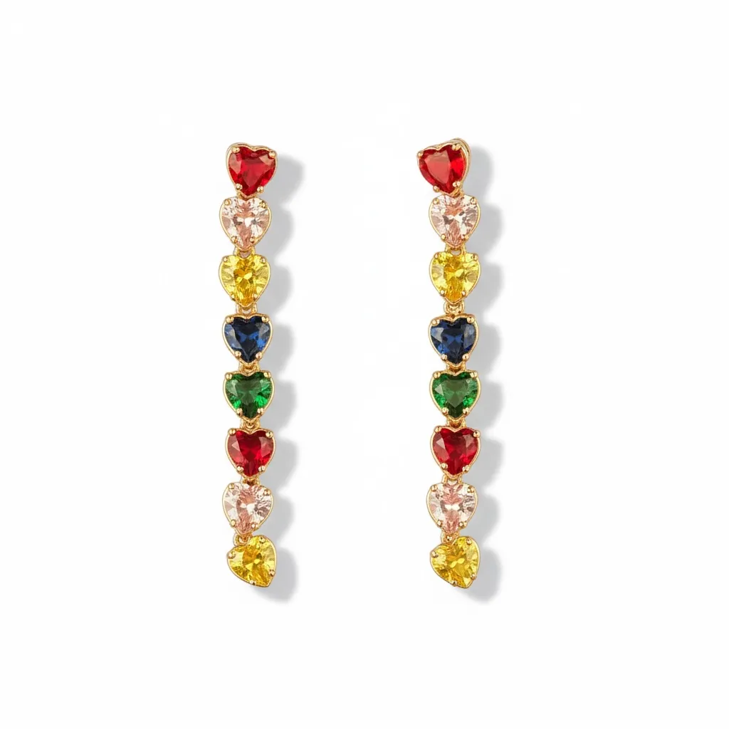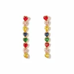Rainbow Heart Drop Earrings Vibrant, joyful, and full of charm, the Rainbow Heart Drop Earrings feature a vertical cascade of colorful heart-shaped crystals set in a sleek gold-tone frame. Each hue adds a playful pop of color, creating a lively yet elegant statement piece.