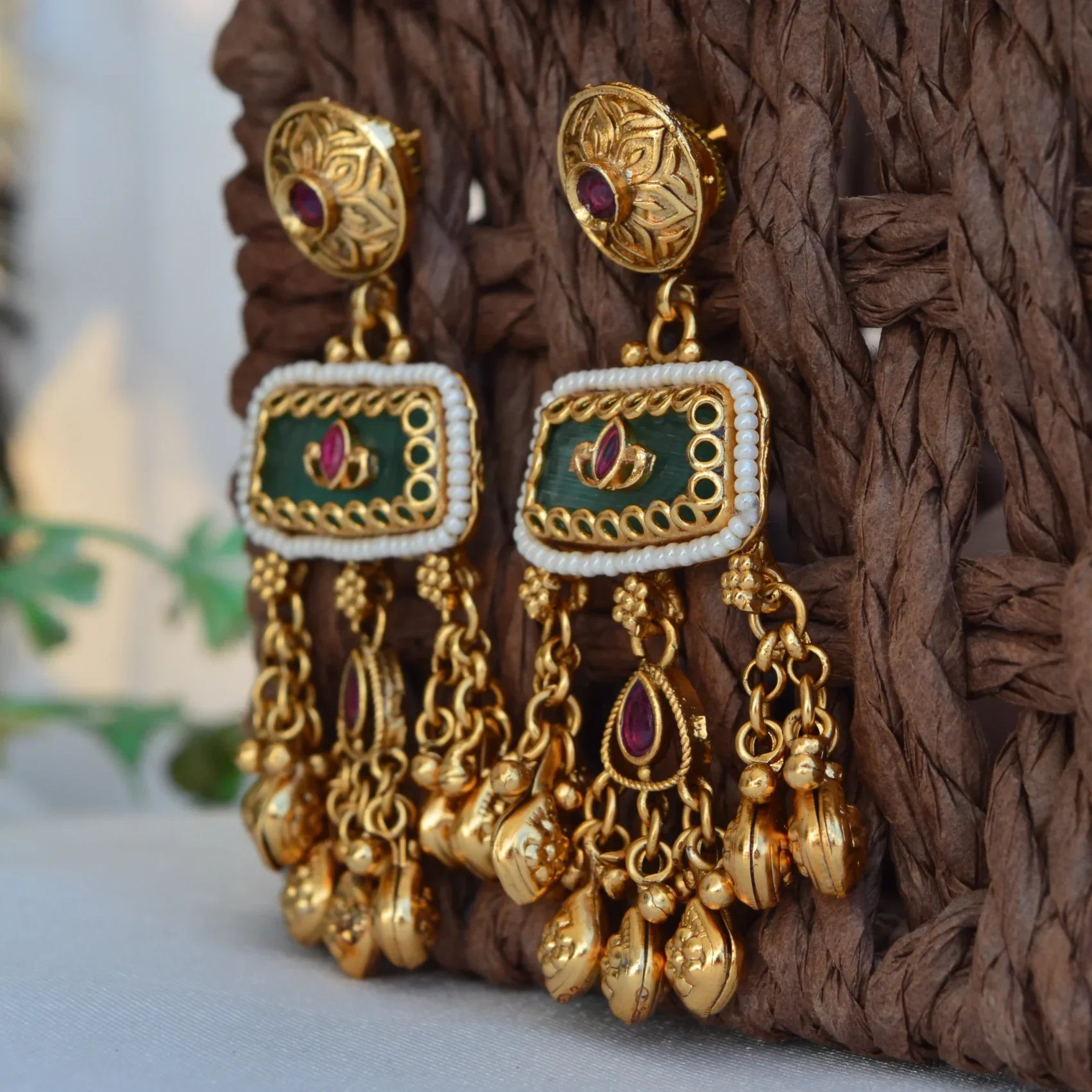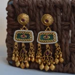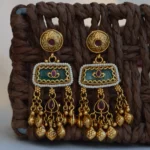 The Rajputana Heritage Jhumka Drops celebrate the opulence of traditional Indian craftsmanship. These earrings feature intricately detailed golden studs paired with a rectangular enamel centerpiece in royal green, adorned with delicate beadwork and miniature motifs for an authentic regal touch.