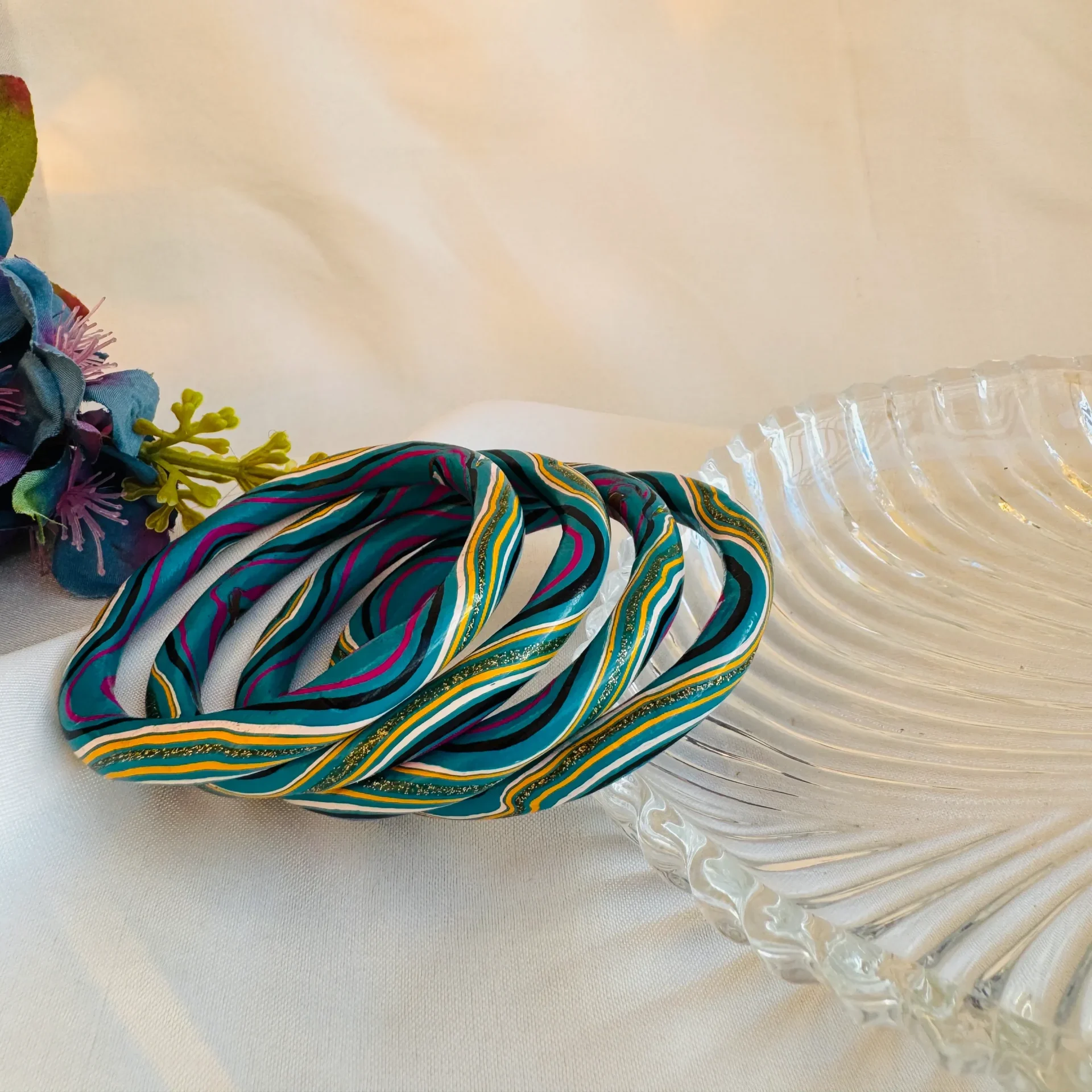 Rangrez Multi Colour Lac Bangle unleashes a rainbow of turquoise, pink, green, and gold twists in a set of four, dyed like a traditional rangrez’s vibrant palette. Each piece boasts glossy lac for a lightweight, snag‑free fit that lasts from morning to night. Stack them all for explosive festival energy or mix subsets for colourful daily outfits that demand attention.