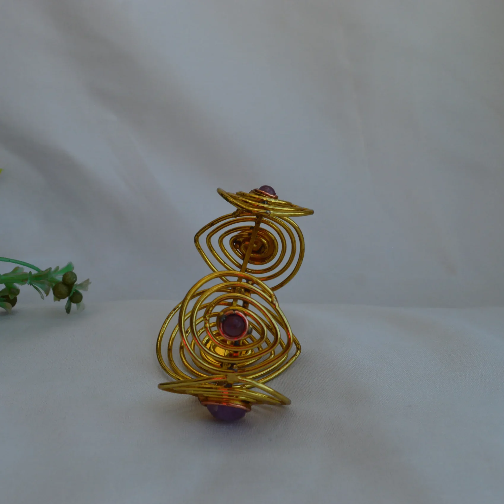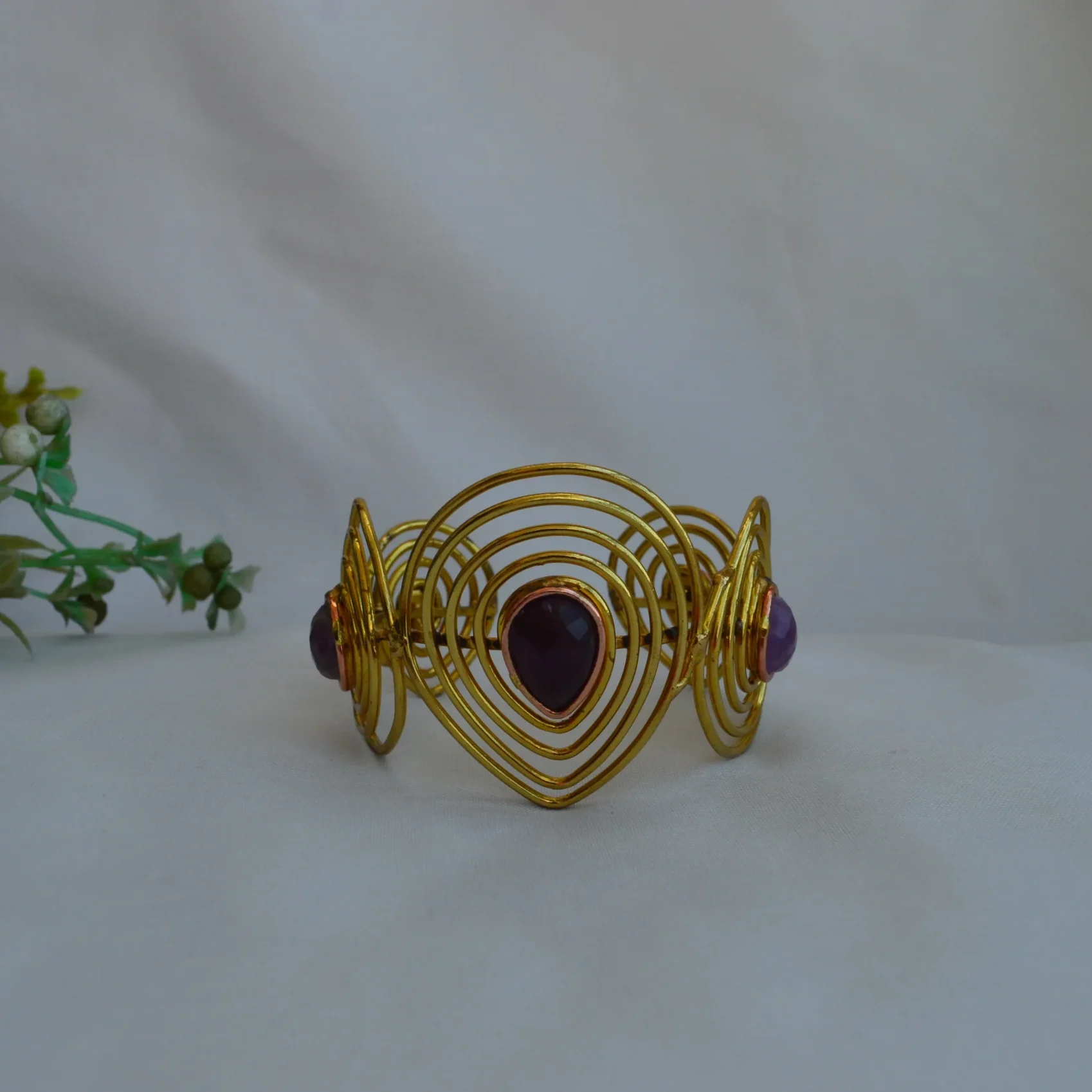 Bold, artistic, and royal in presence — the Regal Orbit Gem Cuff is crafted to captivate. Featuring layered concentric arcs in a luxurious gold finish, this statement bracelet is centered with a deep, teardrop-shaped gemstone, adding a rich hint of color and elegance.Finished with a premium anti-tarnish coating, it maintains its brilliance and resists dulling, ensuring enduring shine and sophistication.