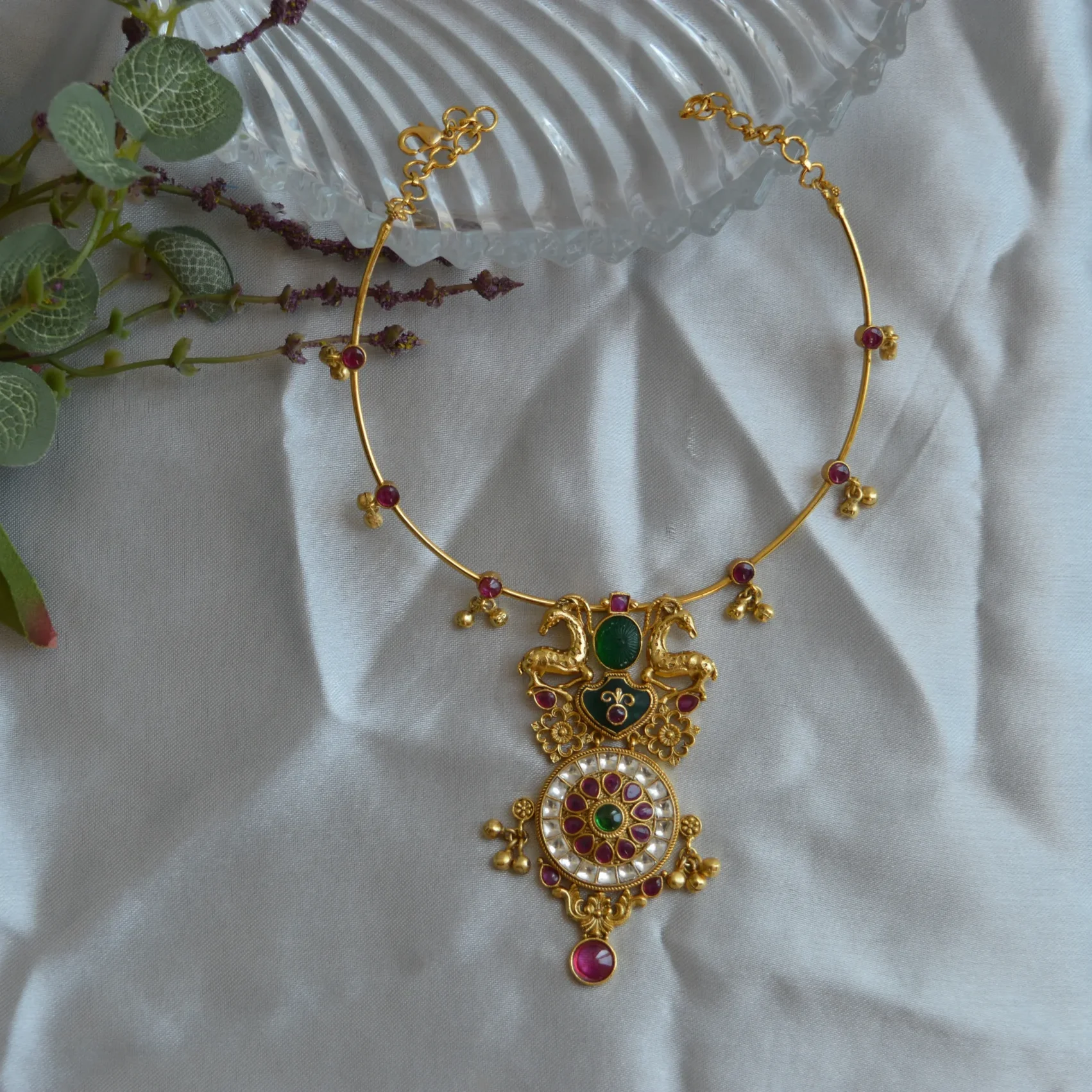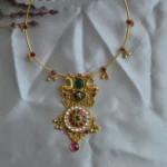 This Royal Heritage Peacock Medallion Necklace features a beautifully detailed dual-peacock motif set in antique-finish gold. Adorned with rich emerald and ruby-toned stones, the pendant is completed with a circular pearl-studded medallion that reflects timeless regal artistry. Suspended from a delicate wire necklace accented with ruby beads, this piece is a perfect blend of tradition, culture, and exquisite craftsmanship.