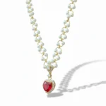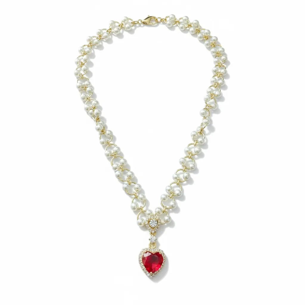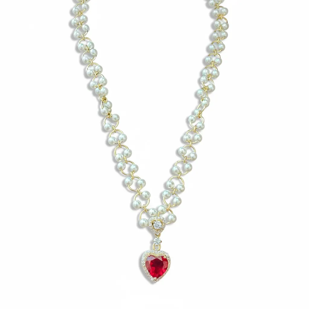 Scarlet Pearl Heart Necklace A graceful blend of romance and classic elegance, the Scarlet Pearl Heart Necklace features a strand of luminous pearl beads paired with a striking red heart pendant framed in gold. The soft glow of pearls beautifully contrasts with the rich crimson charm, creating a timeless piece that feels both delicate and statement-worthy.