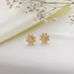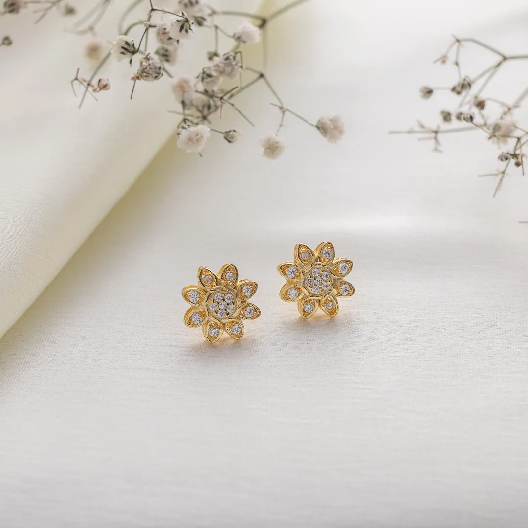 Illuminate your style with the Sunlit Petal Bloom Studs, inspired by the beauty of fresh blossoms kissed by morning light. These elegant earrings feature a radiant flower design, created with delicately sculpted gold-tone petals and sparkling stone accents that mimic nature’s soft glimmer.