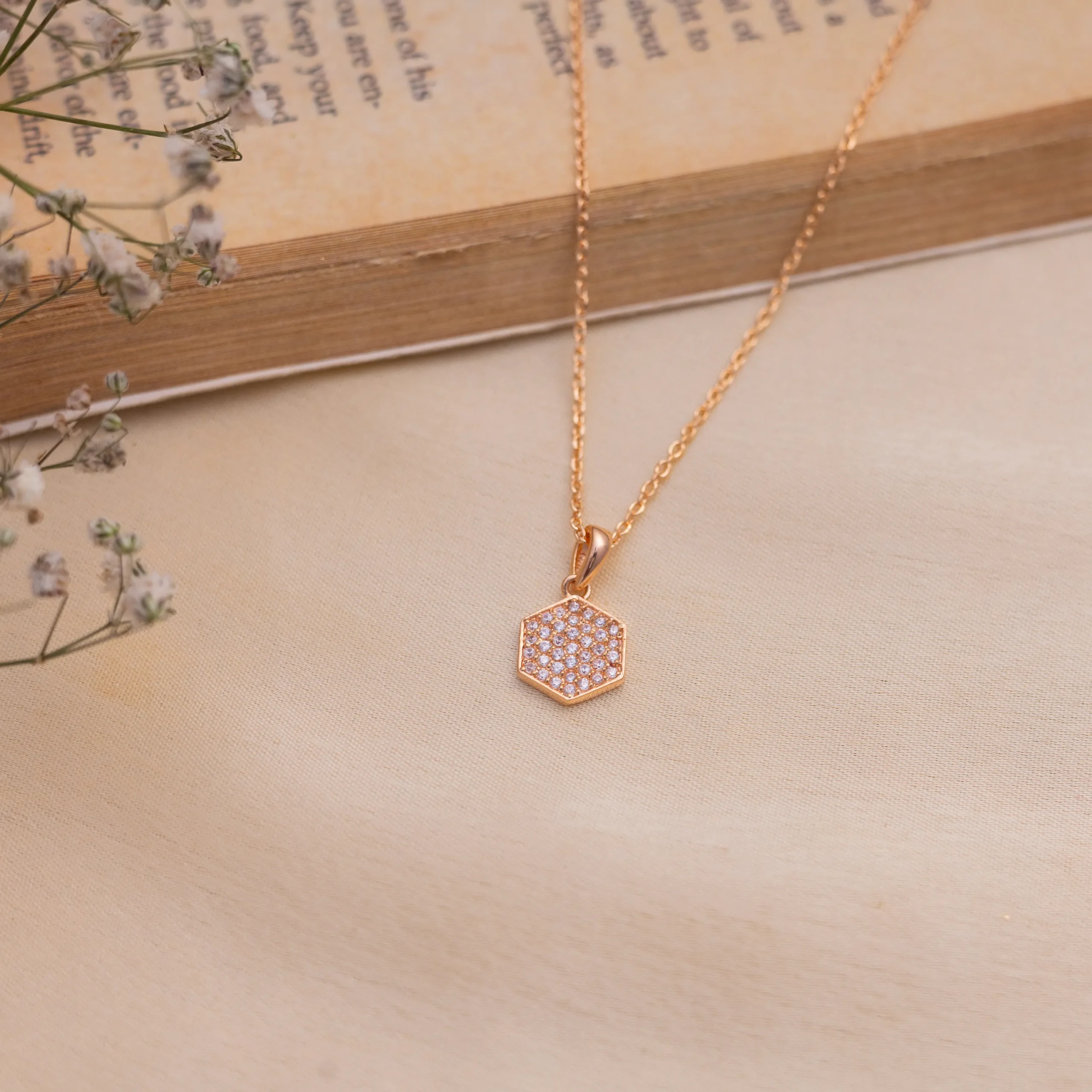 The Aurora Hexa Pendant is a modern masterpiece that embodies elegance in symmetry. Crafted in radiant rose gold, this pendant features a hexagonal charm intricately set with a constellation of shimmering cubic zirconia stones, reflecting light from every angle.