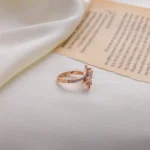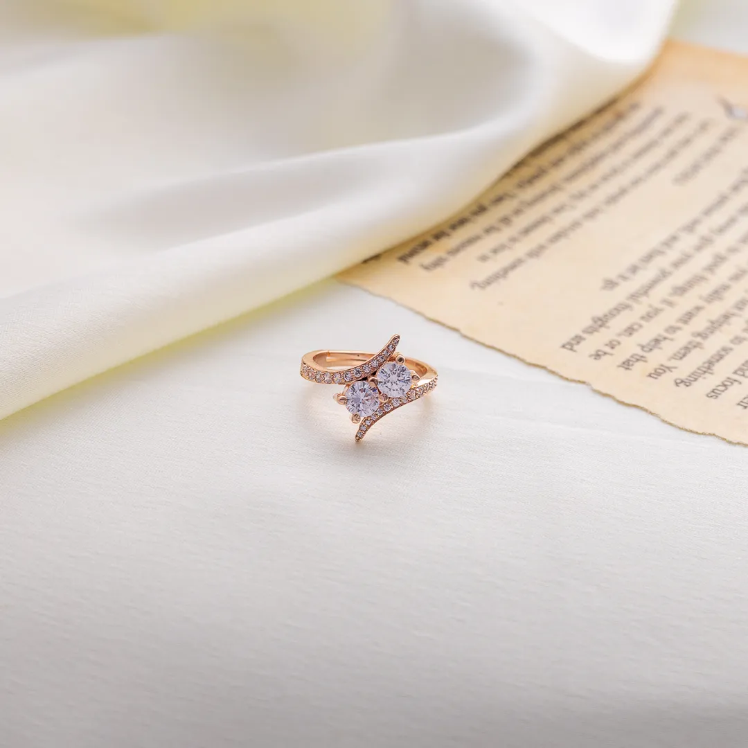 A striking gold-plated ring featuring two brilliant round-cut stones at its center, embraced by gracefully curved bands adorned with delicate pavé-set crystals. Its unique design symbolizes harmony and connection, making it a dazzling statement of elegance.