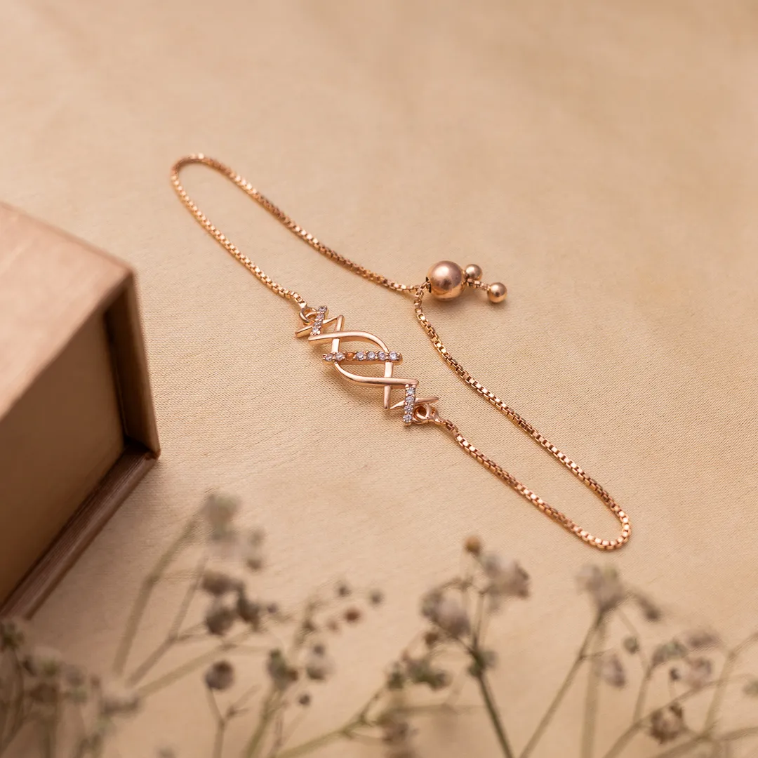 “Twist into timeless shine.” This Gold-toned18k bracelet with a twisted ribbon motif and sparkling stone accents, blending bold curves with refined elegance.