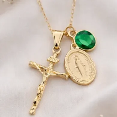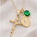 Verde Faith Charm Necklace Crafted for those who cherish both spirituality and style, the Verde Faith Charm Necklace brings together a gold cross, Miraculous Medallion, and a luminous green gemstone charm. The soft satin backdrop highlights its graceful detailing, making it an effortlessly chic statement of belief, hope, and individuality.